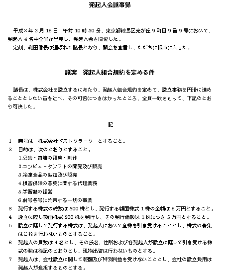 | 会社設立前に発起人組合規約を定め、商号(社名)、目的(事業内容)、発起人(株主)等を決定 |