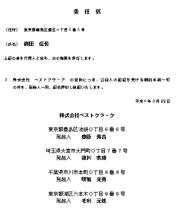 | 発起人全員の公証立会が原則 立会できない発起人が記載の委任状 |