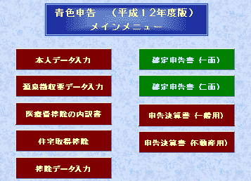 | 【メニュー】本人データ入力 源泉徴収表データ入力 医療費控除の内訳書 住宅取得控除 控除データ入力 確定申告書(一面 二面)申告決算書(一般用 不動産用) |