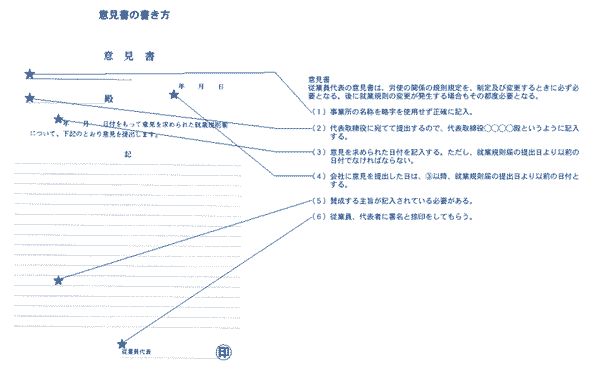 | 意見書の従業員代表とは、監督又は管理の地位にある者でないことや、投票、挙手等の方法による手続により選出された者であること等のきまりがあります |
