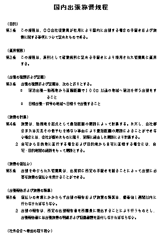 | 仮払いの有無、研修出張、日帰り日当、宿泊日当、出張旅費基準等について必要に応じて、随行旅行規程や海外旅費規程も作成しましょう |