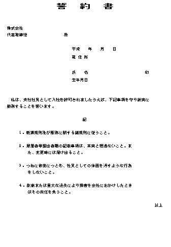 | 私は、貴社社員として入社を許可されましたうえは、下記事項を守り誠実に勤務することを誓います。1.就業規則及び服務に関する諸規則に従うこと・・・ |