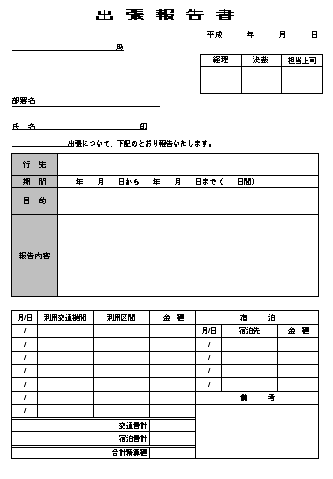 | 出張終了後に報告事項を記し、旅費の仮払い精算をする文書です。報告事項は自由な記載がよいでしょう。 |