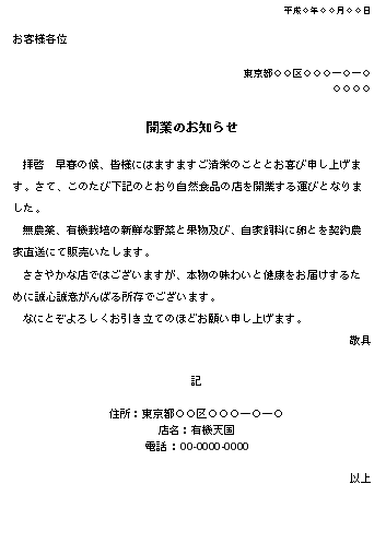 | さて、このたび下記のとおり自然食品の店を開業する運びとなりました。無農薬、有機栽培の新鮮な野菜と果物及び、自家飼料に卵とを契約農家直送にて販売いたします・・・ |