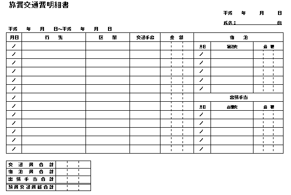 | 旅費交通費明細書 ヨコ型 月日 行先 区間 交通手段 金額 ×13行。宿泊 月日 宿泊先 金額 ×5行 出張手当 月日 出張先 金額 ×5行 |
