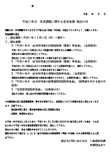 | 年末調整を行いますので下記の通り各種「申告書」を提出下さいますよう・・・1.提出期限・・・2.提出書類 ?「平成×年分 給与所得者の扶養控除等(異動)申告書」・・・ |
