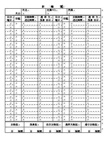 | 押印簿形式。出勤時間、退社時間、残業休日出勤日数、遅刻早退欠勤等を記載。30日間分。 |
