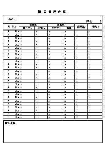 | 一枚のシートで一品目。納品数(購入先・数量)、出品数(使用者・数量)、残高数に分けて管理。27回分記載。 |