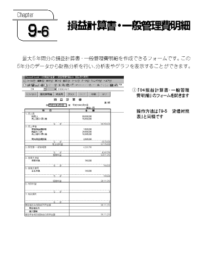 | 最大5年間分の損益計算書・一般管理費明細を作成できます。この5年分のデータから財務分析を行い、時系列分析表やグラフを表示することができます。 |